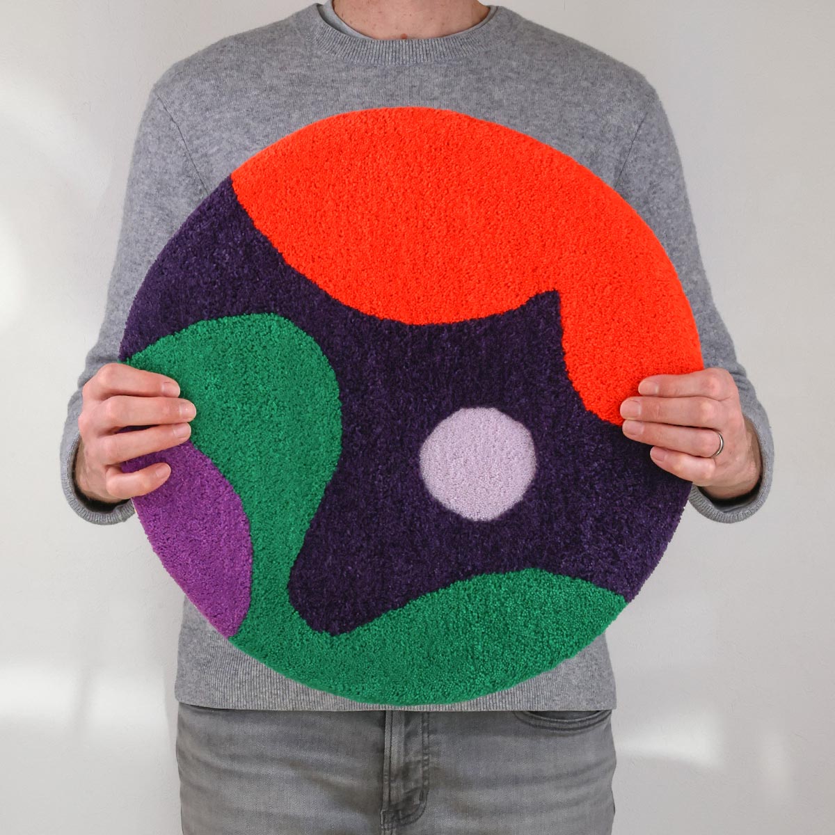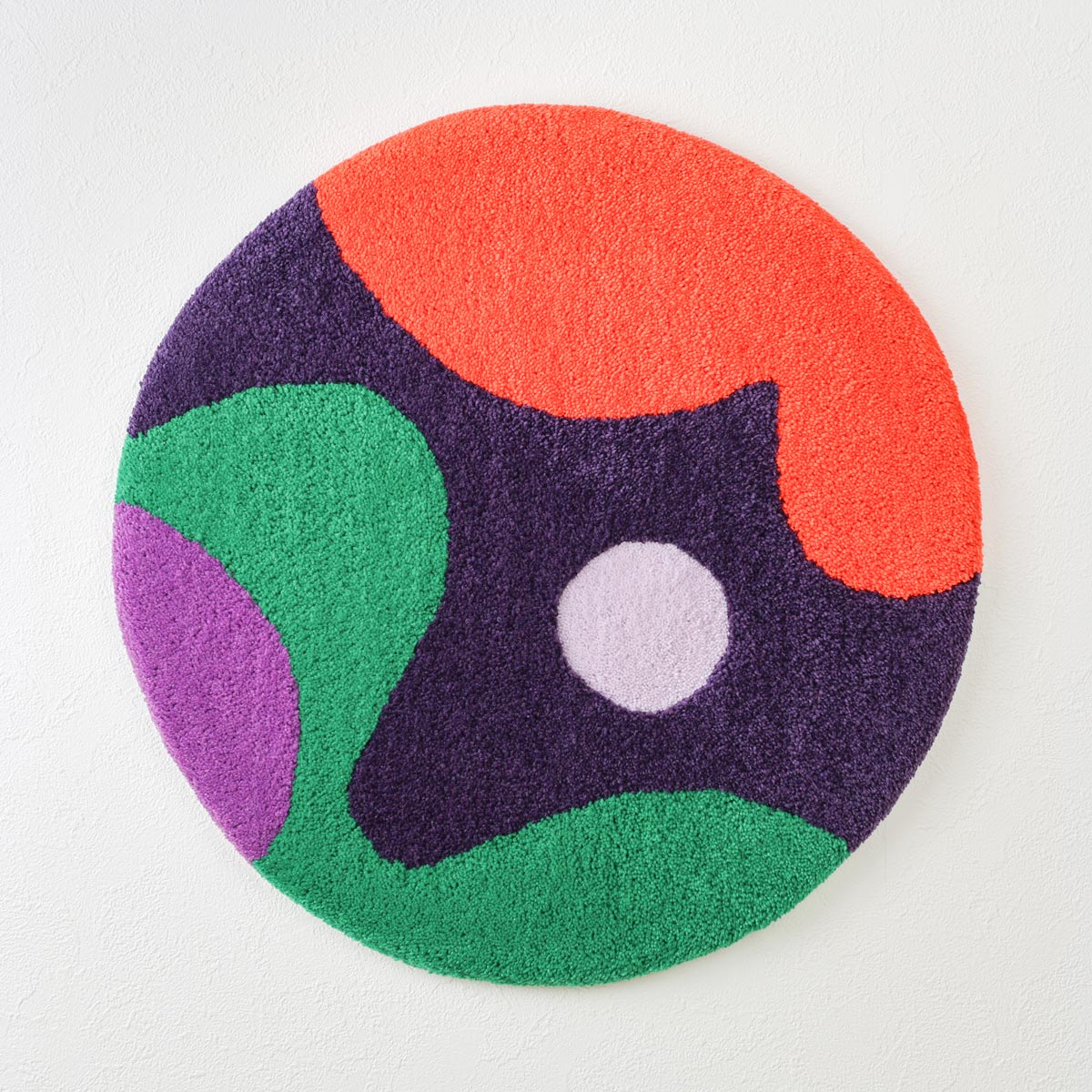 このラグは壁掛け用の吊り下げ機構を備えているが、必要に応じて機能的なアートとして床に置くこともできる。