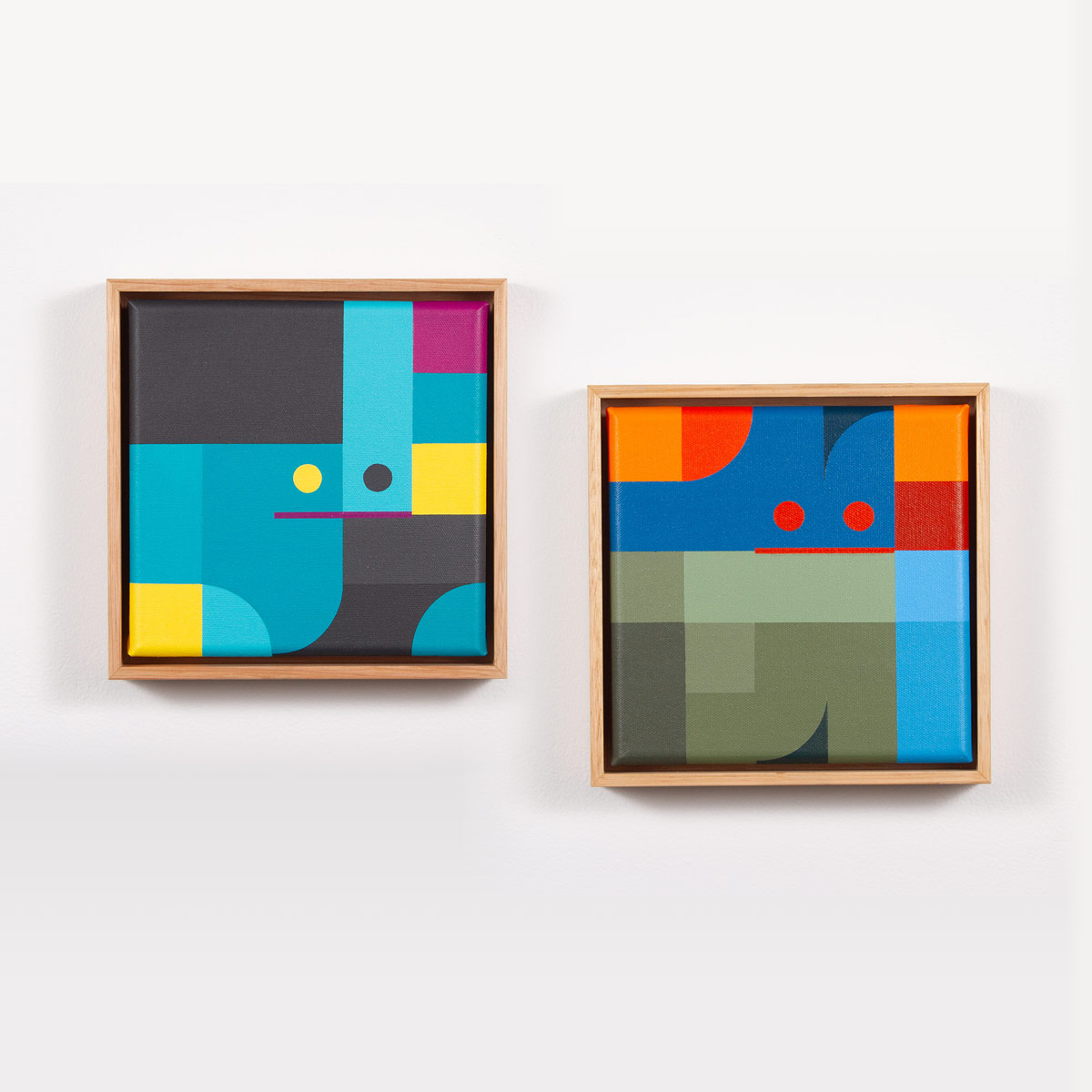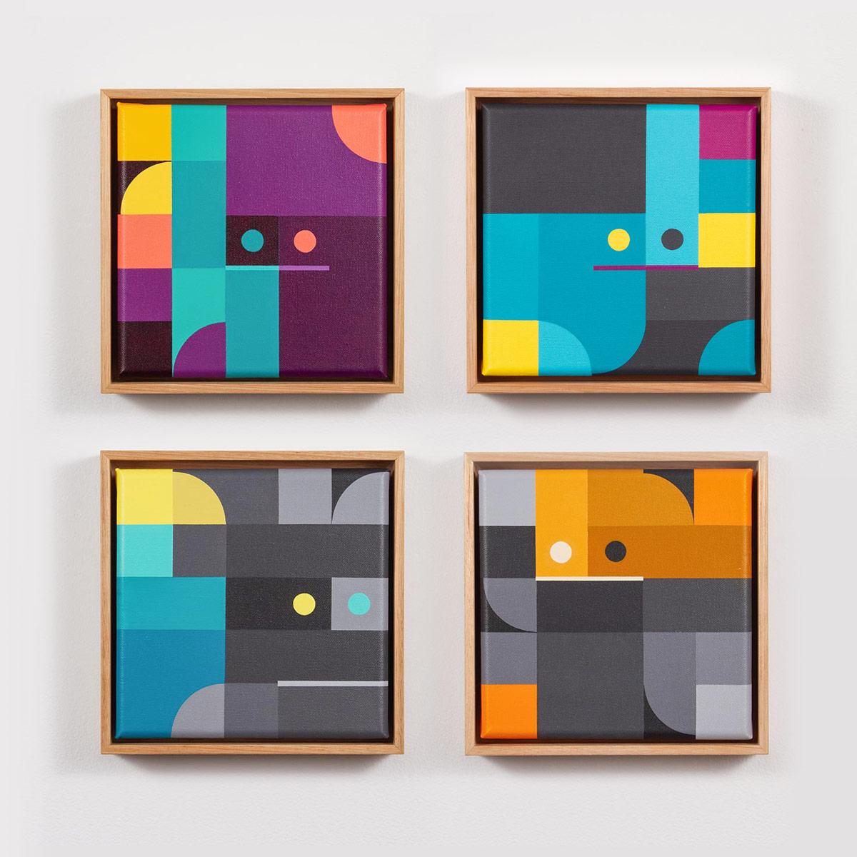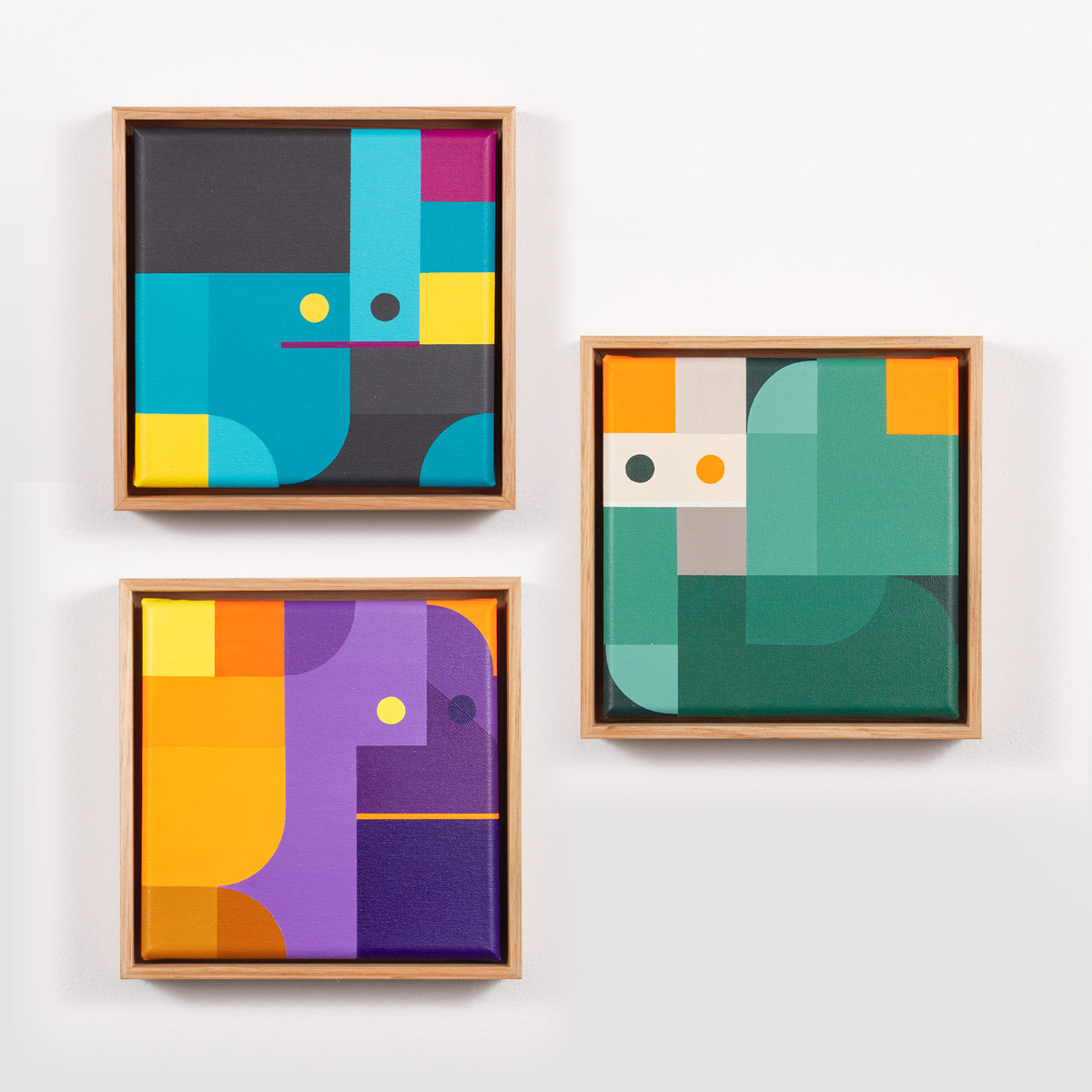 グール・ガイがキャンバスにアクリルで描いた幾何学的抽象画の謎めいたコレクション。各キャンバスにはサイン、エディションナンバーが入り、タスマニアン・オークで額装されている。