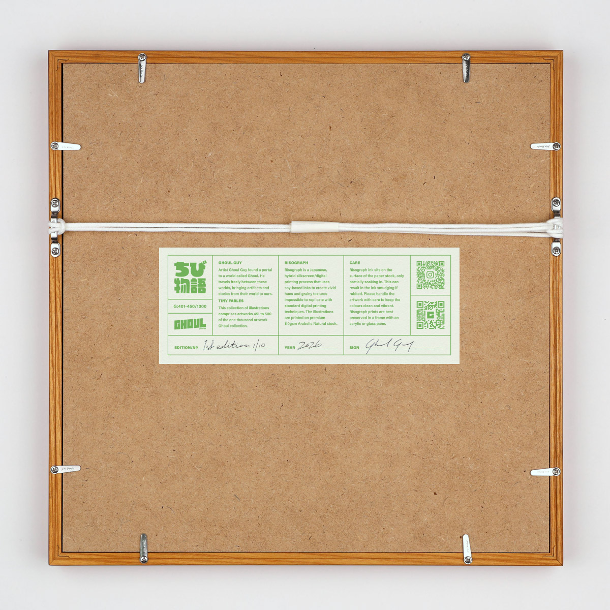 Each artwork sits in a North American Ash frame measuring 32x32cm, preserved behind an acrylic pane and matte board, ready to hang in your home.
