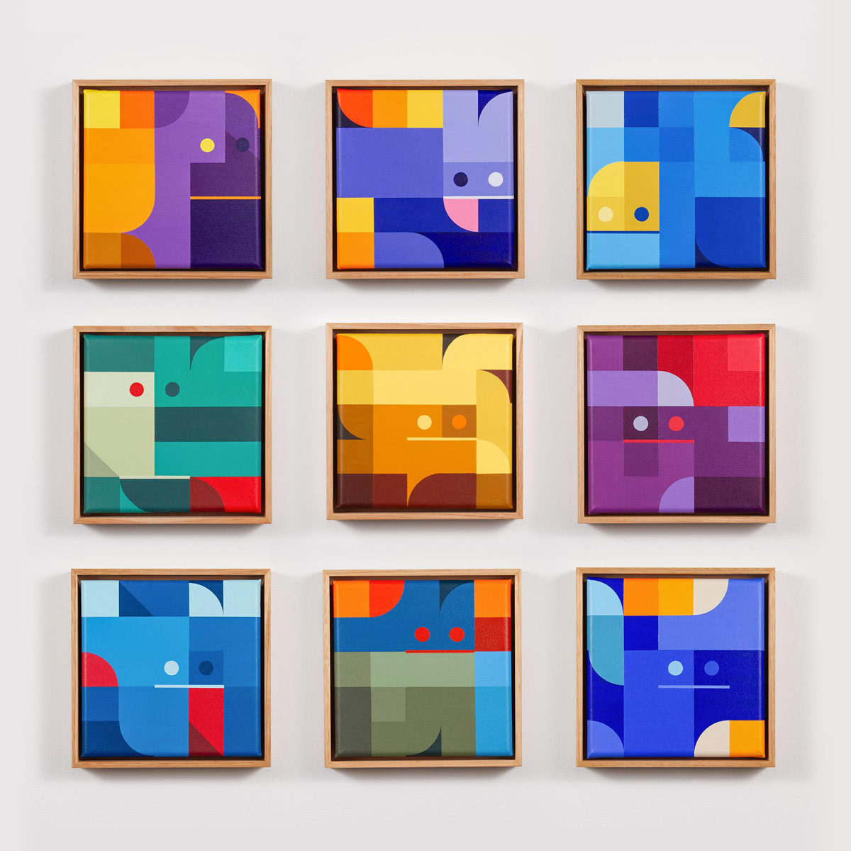 This enigmatic collection of geometric abstractions are painted with acrylic on canvas by Ghoul Guy. Each canvas is signed, numbered, and framed in Tasmanian Oak.
