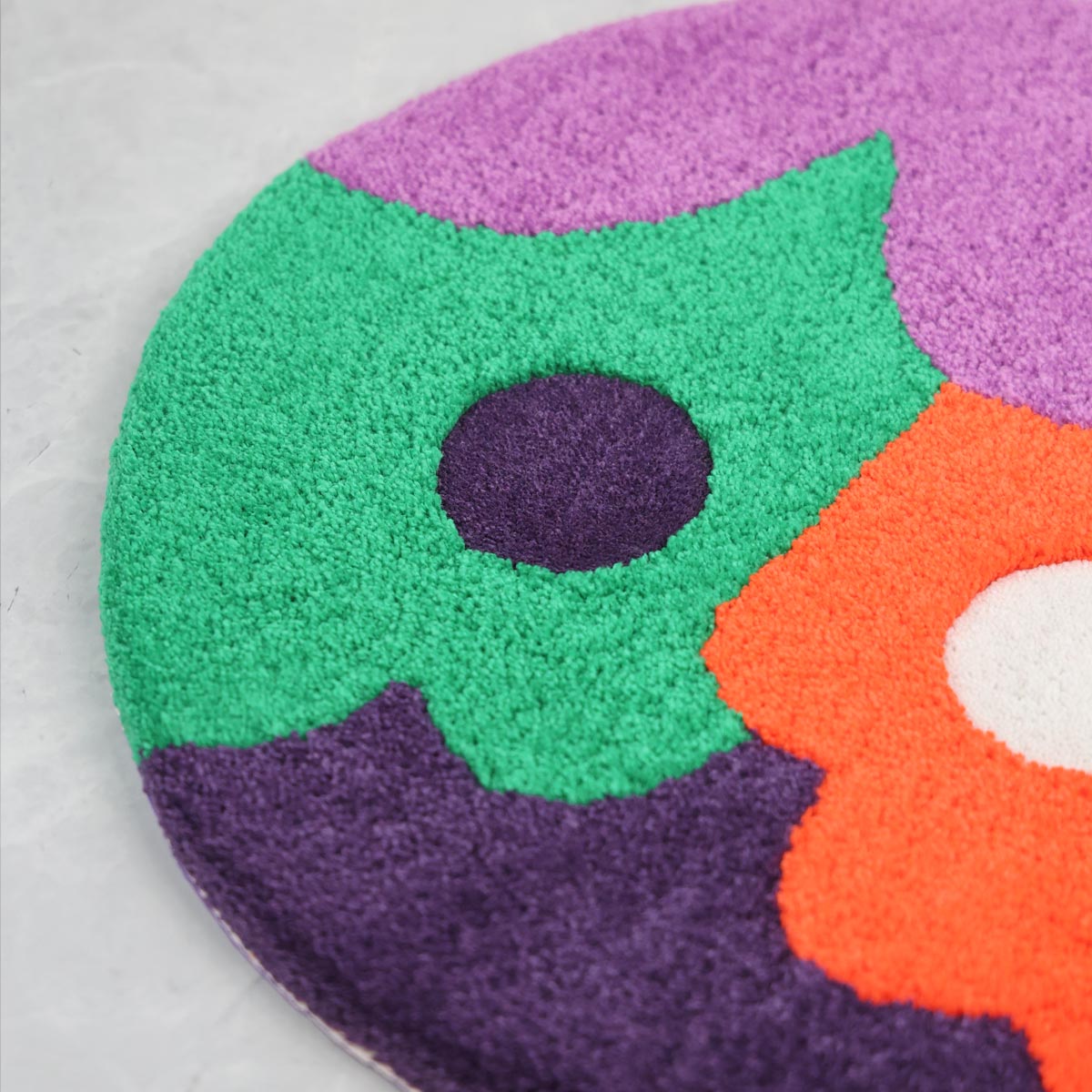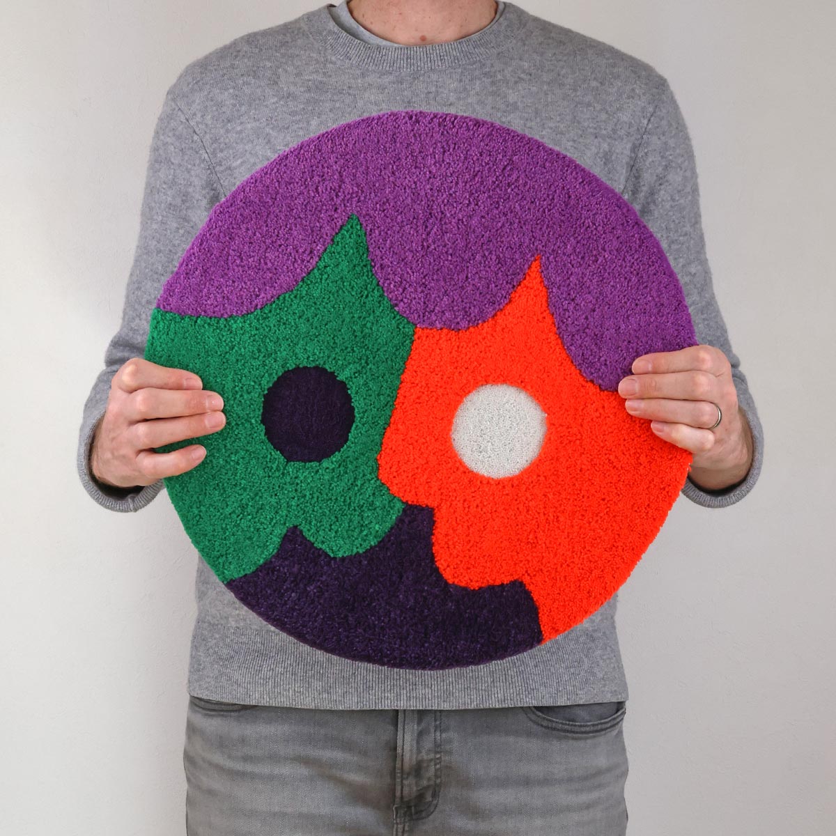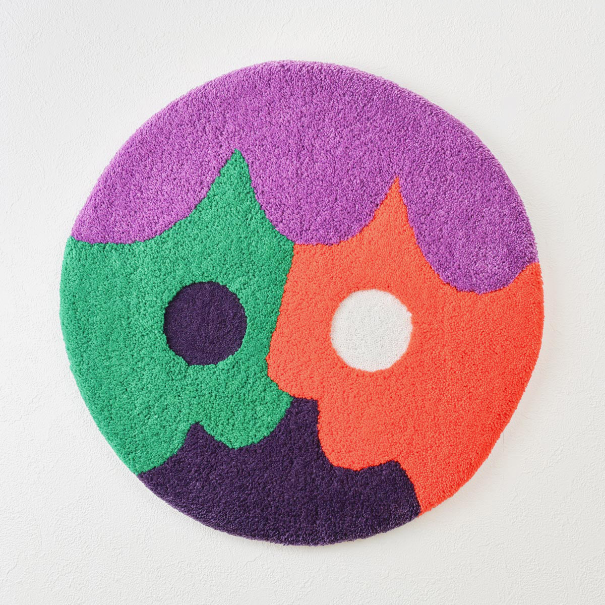 The Magic Carpet Collection is a series of 50 hand-tufted rugs, each measuring approximately 40cm (15.7”) in diameter. Part of a ten year project to create 1,000 artworks, this collection marks the eighth milestone (#351–#400), continuing the theme of anthropomorphism first explored in Ghoul Guy’s Morph series.